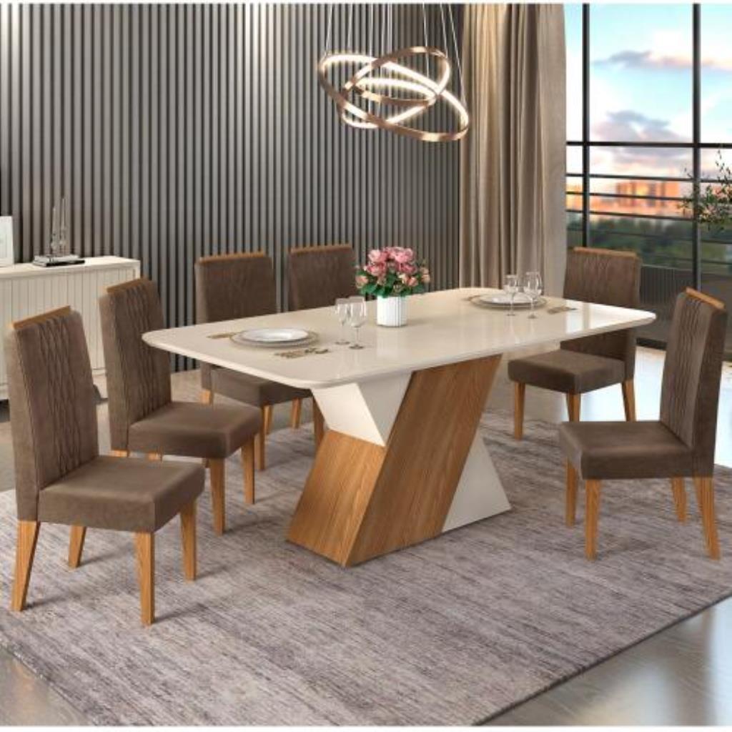 Conjunto de Mesa 6 Cadeiras Tampo MDF Vidro com Assento Estofado DJ Móveis - Carvalho Nobre/Off White