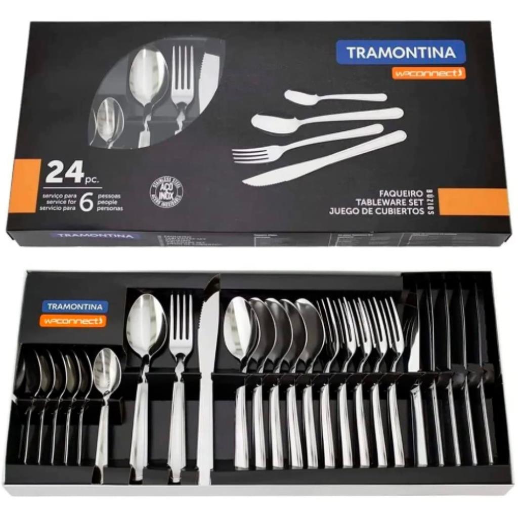 6 garfos de de mesa, 6 facas para churrasco, 6 colheres para chá e 6 colheres de mesa e manual de instruções